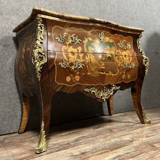 Commode Sauteuse galbée estampillée en Marqueterie de bois précieux Style Louis XV vers 1850