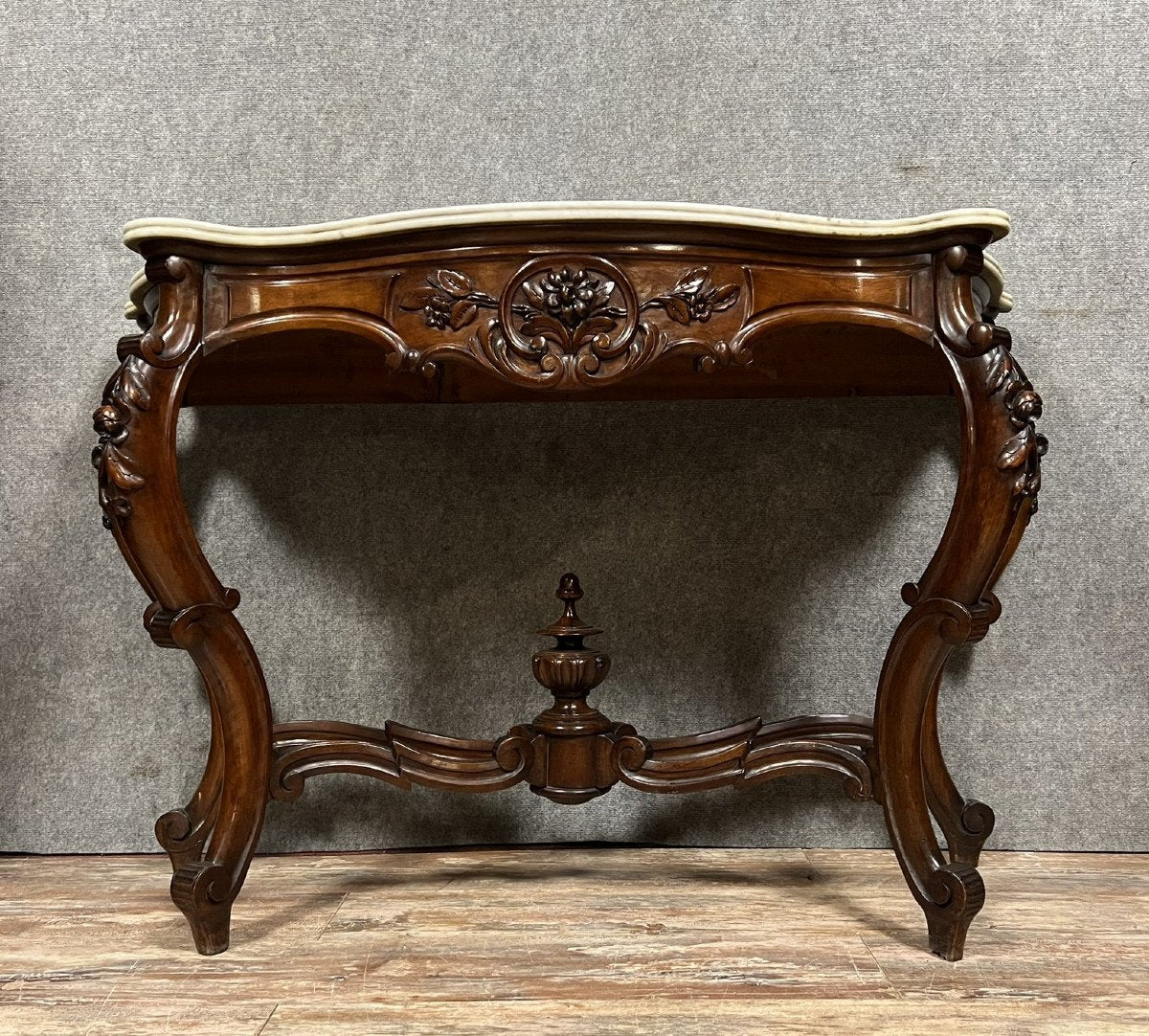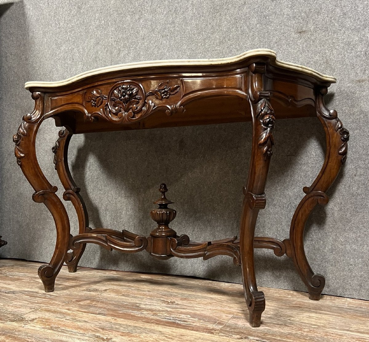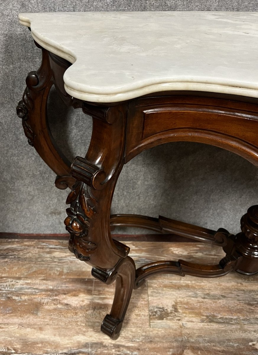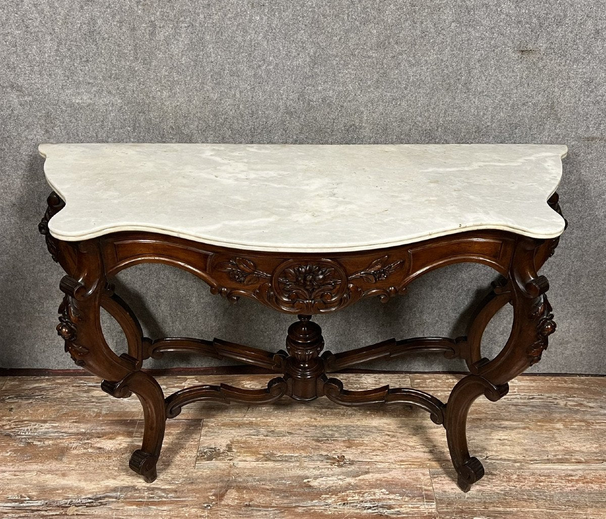 Console galbée de style Louis XV en acajou du 19ème siècle, avec un élégant marbre blanc Carrare mouvementé. Les montants et la ceinture sont superbement sculptés, avec un bouquet de fleurs dans une coquille. Reposant sur des pieds cambrés enroulés, elle est surmontée d'une entretoise en X stylisée avec une grosse bobèche. Dimensions : h89 x 150 x 52. Offrez un charme classique et une qualité exceptionnelle à votre espace avec cette console.